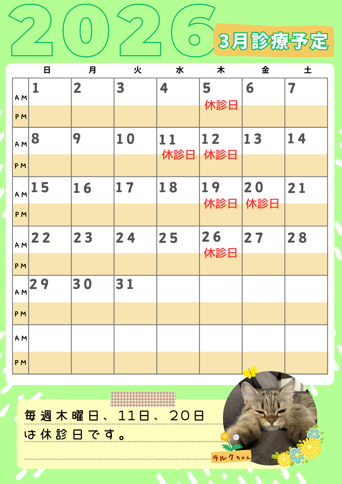こんにちは駅前通り動物病院です。パソコンの調子が悪くなり、予定表の配信が遅くなりました。すみません。3月の予定表になります。ご確認よろしくお願いします。