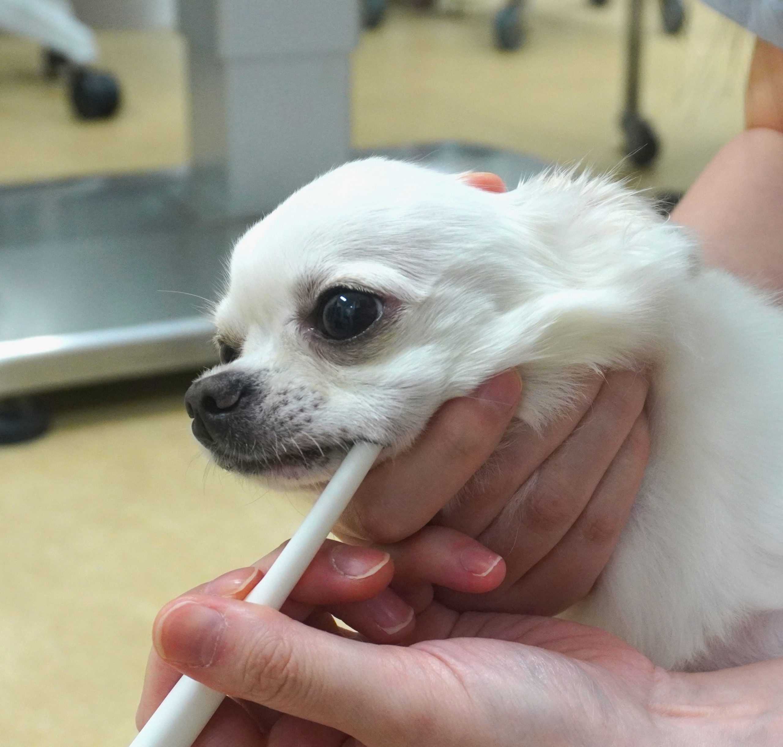 病院が空いているので、病院スタッフのワンちゃん、福丸ちゃんの歯磨きの様子を撮影しました
